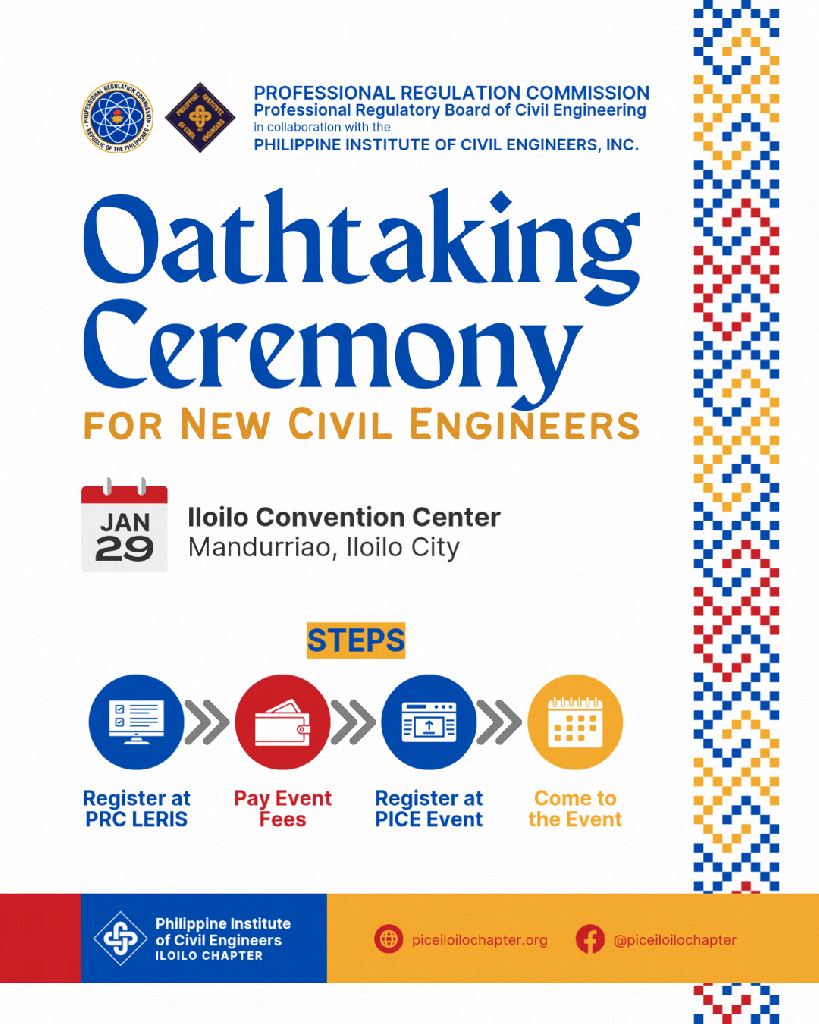 The Philippine Institute of Civil Engineers, Inc. is organizing a Special Oath-Taking Ceremony in collaboration with the Professional Regulation Commission and the PICE Iloilo Chapter. Please take time to read all of the guidelines to avoid any inconvenience during the oathtaking ceremony.
